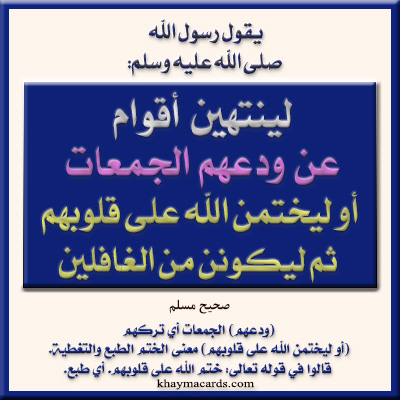 أن عبد الله بن عمر وأبا هريرة حدثاه أنهما سمعا رسول الله -صلى الله عليه وسلم- يقول على أعواد منبره « لينتهين أقوام عن ودعهم الجمعات أو ليختمن الله على قلوبهم ثم ليكونن من الغافلين ».